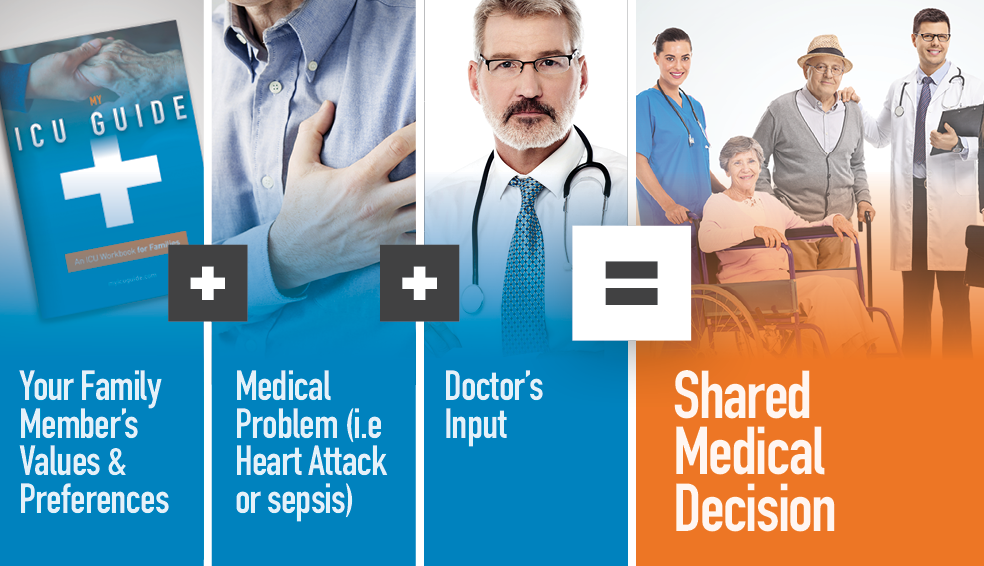 People often find themselves overwhelmed with the thought of making a decision for a critically ill family member, particularly when there is so much uncertainty about what is the best decision. It is important to understand that you should never be asked to make a decision alone. Some people do not want to make decisions at all and prefer that the medical team makes the decisions while others prefer to be more involved. As the Substitute Decision Maker, you can also talk with other family members and friends to help with decision-making. In most circumstances, the family and the health care team will work together to make the best decision for the patient. Your main role is to represent the wishes, beliefs and values of the patient. The health care team’s main role is to provide you with information and explore the treatment options for your family member. As a team, you and the healthcare providers can make decisions that balance your family member’s wishes, beliefs and values with the treatment options available. These decisions form the foundation of the care plan moving forward.
